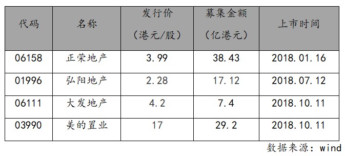 智通財經(jīng)APP獲悉,10月11日,大發(fā)地產(chǎn)(06111.HK)、美的置業(yè)(03990.HK)同時在港交所成功掛牌上市,加上此前于1月份上市的正榮地產(chǎn)(06158.HK),7月份上市的弘陽地產(chǎn)(01996,HK),2018年港股上市內地房地產(chǎn)企業(yè)增至四家,共計募資金額為92.15億港元。