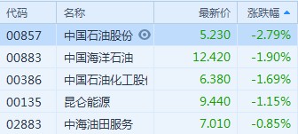 智通財(cái)經(jīng)APP獲悉,受國際油價下跌拖累,早盤石油股全線下滑,截至9時38分,中石油(00857)跌2.79%,報價5.23港元,中海油(00883)跌1.9%,報12.42港元,中石化(00386)跌1.69%,報6.38港元,昆侖能源(00135)跌1.15%,報9.44%港元。