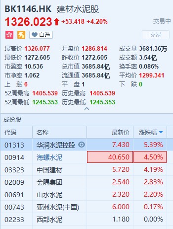 智通財經APP獲悉,水泥股集體上漲,截至發(fā)稿,建材水泥板塊(BK1146)上漲4.2%。華潤水泥控股(01313)領漲板塊,截至11時15分,華潤水泥漲5.39%,報價7.43港元,海螺水泥(00914)漲4.5%%,報40.65港元,中國建材(03323)漲4.19%、金隅集團(02009)漲2.83%。(林宥辰)