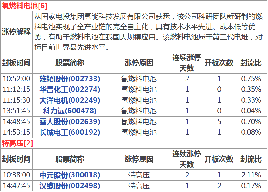 漲停分析:氫燃料電池走強次新股多股漲停(1月11日)
