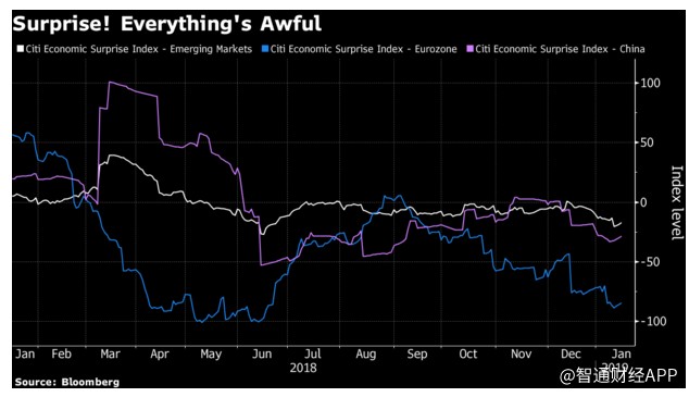 兩位分析師表示,歐洲和新興市場的經(jīng)濟驚喜指數(shù)均陷入負值區(qū)間。而標普500指數(shù)成份股公司約有三分之一的營收來自海外,海外市場的進一步疲軟可能最終會令美國國內(nèi)的增長前景變得黯淡。此外,美國國內(nèi)的經(jīng)濟增長前景在一定程度上也已經(jīng)因美國政府部分關(guān)門而減弱。