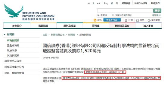 智通財(cái)經(jīng)APP獲悉,香港證監(jiān)會(huì)18日發(fā)布消息稱,國(guó)信證券(香港)經(jīng)紀(jì)有限公司因違反有關(guān)打擊洗錢(qián)的監(jiān)管規(guī)定,遭香港證監(jiān)會(huì)譴責(zé)及罰款1520萬(wàn)港元。