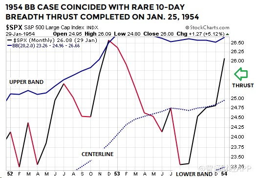 1954年1月最后一個(gè)交易日結(jié)束后,當(dāng)時(shí)的布林通道月線圖與2019年1月末時(shí)的極為相似: