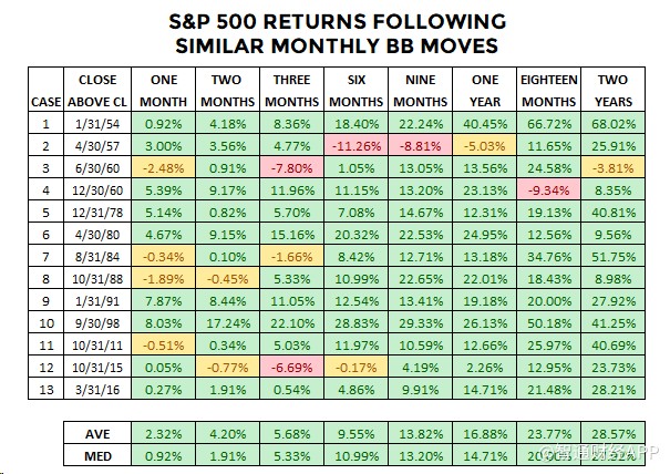 追溯到1950年,標(biāo)普500指數(shù)的月線圖出現(xiàn)過13次相似的走勢。如下表所示,在這一形態(tài)出現(xiàn)后的兩年里,股市基本上一直走牛: