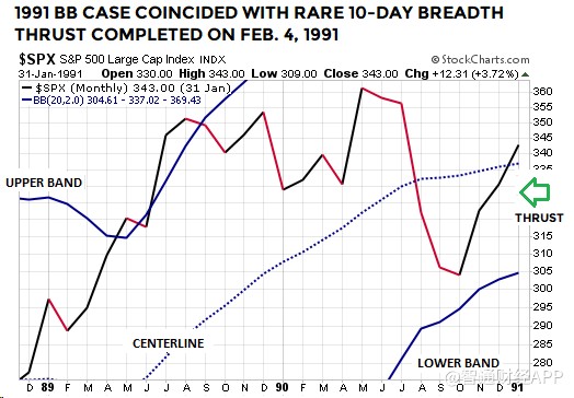 上述布林通道技術(shù)形態(tài)屬較為罕見的類型。值得注意的是,1954年和1991年時(shí)的另一技術(shù)指標(biāo),廣量沖力指標(biāo),基本上與2019年1月21日出現(xiàn)的廣量沖力指標(biāo)形態(tài)類似。因此,在1954年、1991年和2019年,標(biāo)普500指數(shù)走出了布林通道及廣量沖力指標(biāo)都相似的技術(shù)形態(tài)。