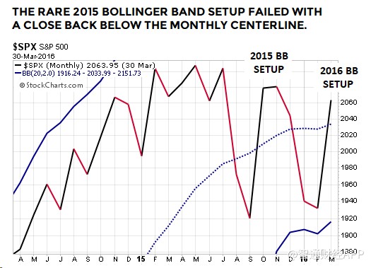 標(biāo)普500指數(shù)從布林通道月線中軌以上跌至中軌以下,然后再反彈收高于中軌以上,并在此期間一直維持在下軌以上,這是標(biāo)準(zhǔn)普爾500指數(shù)相對少見的走勢,而這正是2018年至2019年發(fā)生的情況。