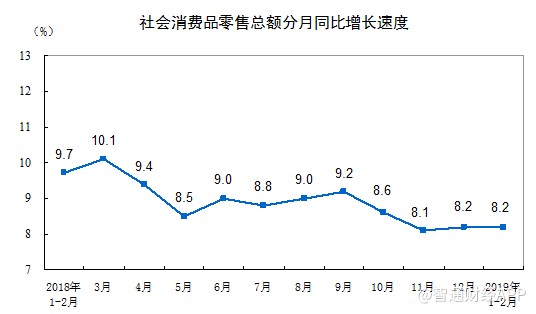 智通財經(jīng)APP獲悉,國家統(tǒng)計局公布,2019年1-2月份,社會消費(fèi)品零售總額66064億元,同比名義增長8.2%,符合預(yù)期,但低于前值增長9%。其中,限額以上單位消費(fèi)品零售額23096億元,增長3.5%。