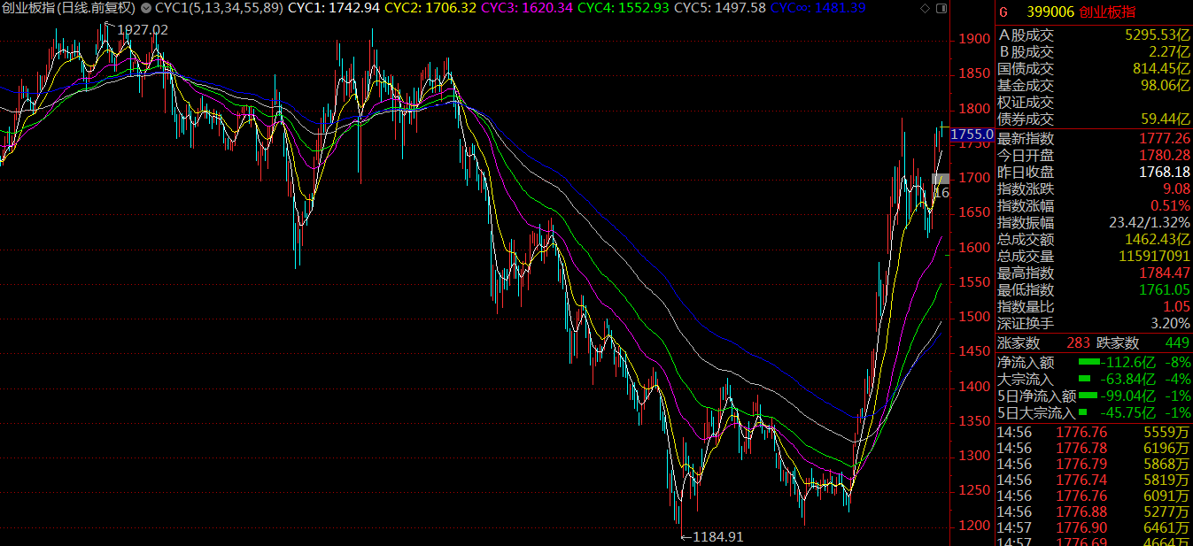 周一市場突破三月份的中樞結(jié)構(gòu),開啟了新一輪的上漲,市場情緒良好,基本維持了日均百股漲停的規(guī)模。至周四,滬指上漲5.04%報(bào)收3246.57點(diǎn),深成指漲5.14%報(bào)收10415.8點(diǎn),創(chuàng)業(yè)板漲4.94%報(bào)收1777.26點(diǎn)。值得留意的是,相較于第一波行情創(chuàng)業(yè)板指數(shù)大幅跑贏上證指數(shù)來說,這一次代表小盤股的創(chuàng)業(yè)板指數(shù)要弱于預(yù)期。