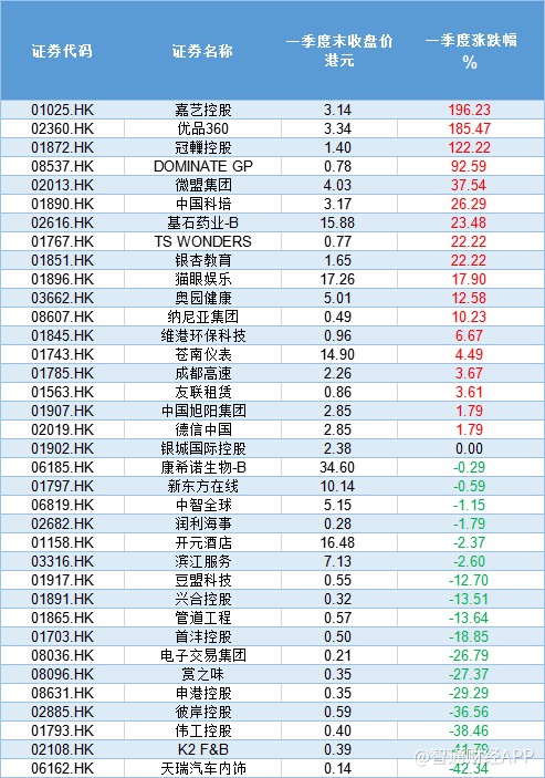 另外,截至一季度底,36只新股中,共有14只股失守發(fā)行價(jià),破發(fā)率為39%。值得的注意的是,相比于2018年港股新股70%的破發(fā)率,2019年一季度的破發(fā)率有明顯的下降。其中,天瑞汽車內(nèi)飾以42.36%,成為一季度市場表現(xiàn)最差新股。而嘉藝控股則以196.23%的漲幅,成為一季度市場表現(xiàn)最牛新股。(陳嘉林)
