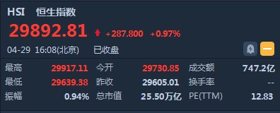智通財經(jīng)APP獲悉,恒指早盤高開125.84點或0.43%,報29730.85點。截至收盤,恒生指數(shù)漲287.8點或0.97%,報29892.81點,全日成交額達747.22億。國企指數(shù)漲1.11%,報11638.18點,紅籌指數(shù)漲0.83%,報4620.34點。