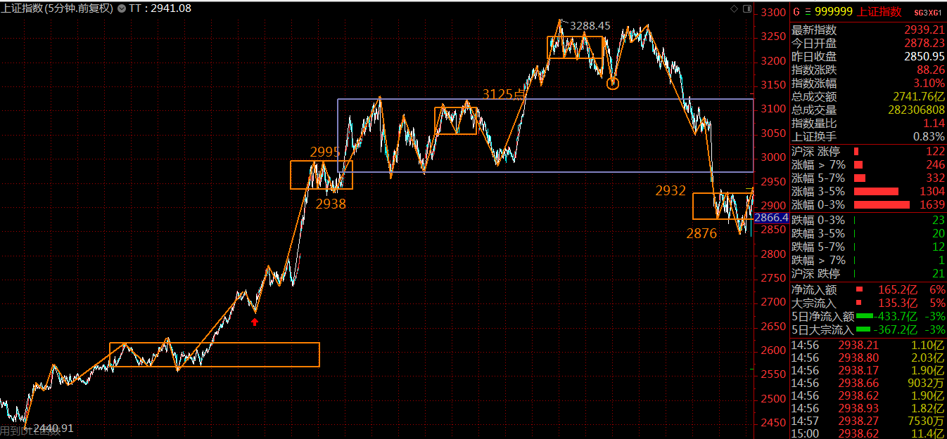再看5分鐘級別走勢結(jié)構(gòu),在特朗普的幫助下,這里直接跌穿了三月份構(gòu)建的三十分鐘級別中樞,力度較大。周五逆轉(zhuǎn)趨勢后,在三十分鐘中樞下面,完成了這段下跌趨勢第二個五分鐘中樞的構(gòu)建工作。大概率宣告了這段五分鐘下跌趨勢的終結(jié)。下周一、周二,上證指數(shù)面臨了上方30分鐘中樞下軌2968點(diǎn)的反壓,可能會出現(xiàn)回落,投資者可逢低吸納。