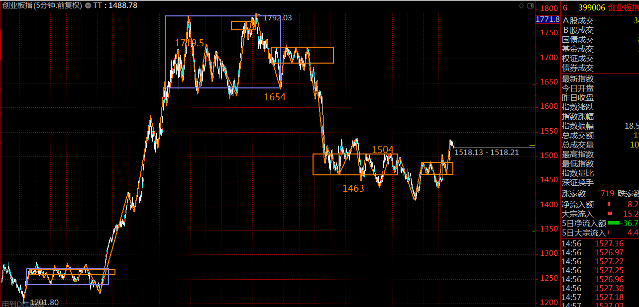 創(chuàng)業(yè)板空間可能相對較大,壓力位在1654點(diǎn)附近,這里同樣是處在五分鐘上漲趨勢中,耐心持股待漲,直至出現(xiàn)五分鐘趨勢背馳為止。