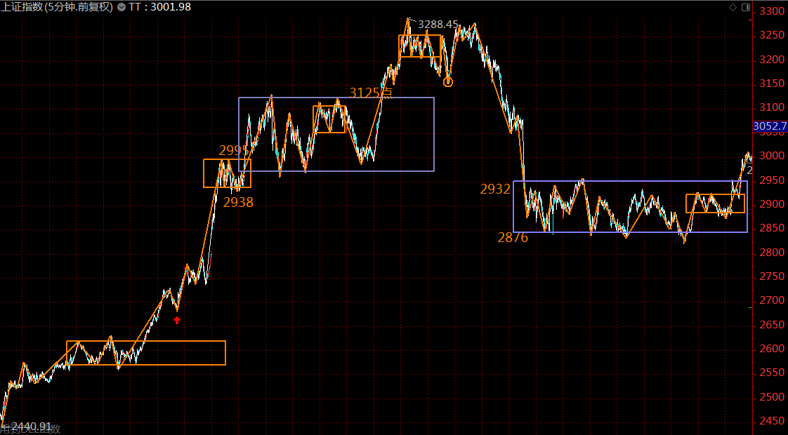 下圖為上證指數(shù)五分鐘級別走勢結(jié)構(gòu)。目前已正式突破5月6日開始構(gòu)建的三十分鐘中樞,目前在5分鐘的上漲趨勢中,未有結(jié)束的征兆,投資者宜全力做多,直至出現(xiàn)五分鐘上漲趨勢背馳為止,按壓力位看,大約在3050點(diǎn)附近。風(fēng)險(xiǎn)控制線2932點(diǎn)。