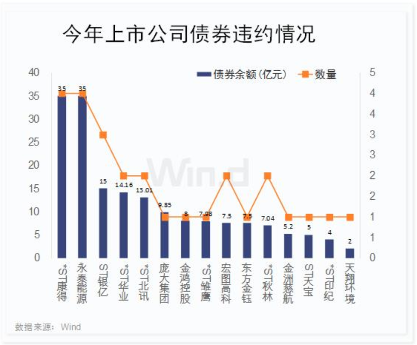 Wind數(shù)據(jù)顯示,今年以來,兩市共有15家A股上市公司累計(jì)27只債券違約,涉及債券余額總計(jì)176.24億元。