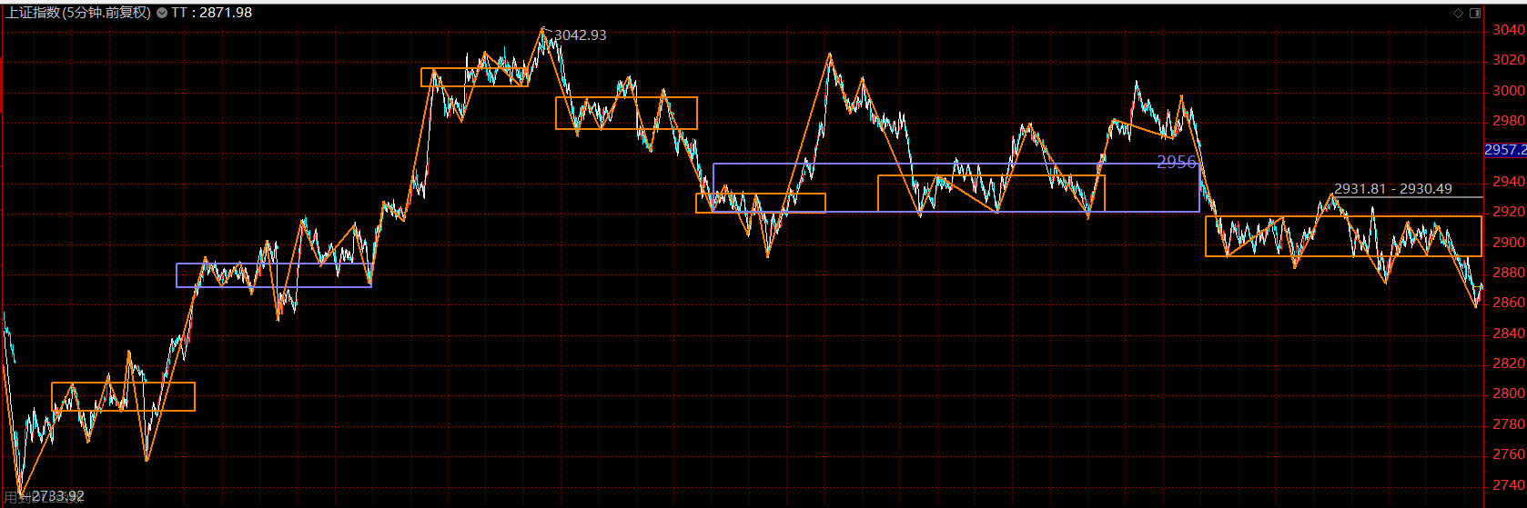 上證指數(shù)上周在等待中樞擴(kuò)展完成后破位下跌,破位力度比較小,而對結(jié)構(gòu)分解后發(fā)現(xiàn),這次大中樞的盤整背馳,第一段以五分鐘趨勢的形式完成,第二段以盤整的形式完成,且已進(jìn)入了尾聲。因此,料此輪主跌段不會太久,繼續(xù)維持在前序中樞下軌2850附近企穩(wěn)的判斷。