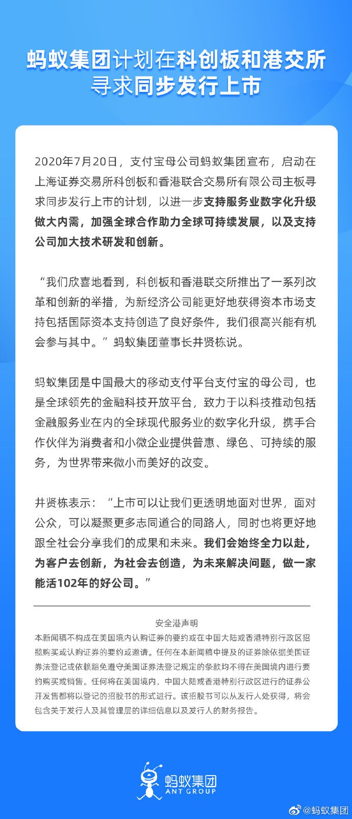 7月20日下午,支付寶母公司螞蟻集團(tuán)在官方微博宣布,該集團(tuán)計劃在科創(chuàng)板和港交所尋求同步發(fā)行上市。