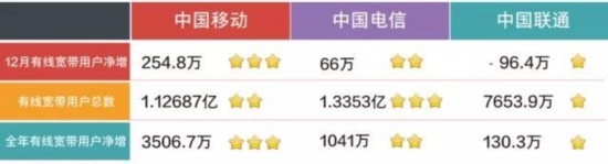 (各個項(xiàng)目中,第一為三顆星,第二為兩顆星,第三為一顆星。以上數(shù)據(jù)測算依據(jù)三大運(yùn)營商公布的營運(yùn)數(shù)據(jù)。)