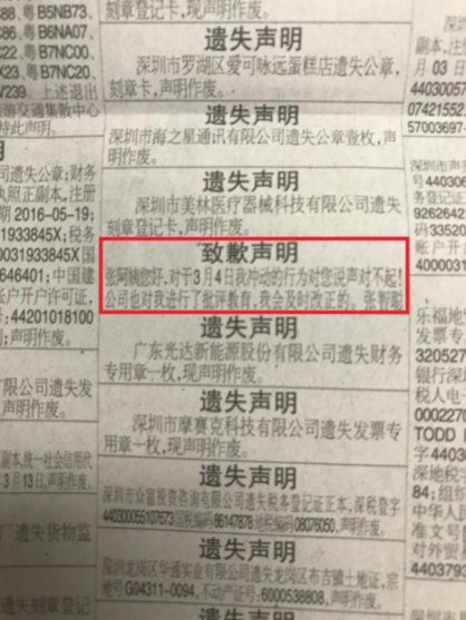 在3月24日的報(bào)紙上,記者在整版密密麻麻的分類信息中,終于找到了埋藏在其中的一條“致歉聲明”——“張阿姨您好,對(duì)于3月4日我沖動(dòng)的行為對(duì)您說聲對(duì)不起!公司也對(duì)我進(jìn)行了批評(píng)教育,我會(huì)及時(shí)改正的。”記者聯(lián)系該版服務(wù)熱線,對(duì)方表示登報(bào)這則致歉聲明的價(jià)格為200元左右。(田志強(qiáng))