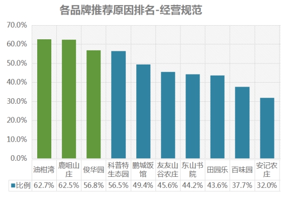 排名第一的是油柑灣,經(jīng)營規(guī)范推薦率為62.7%;其次是鹿咀山莊,推薦率為62.5%;第三名是俊華園,推薦率為56.8%。