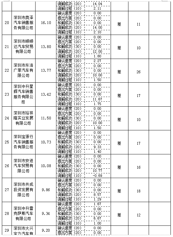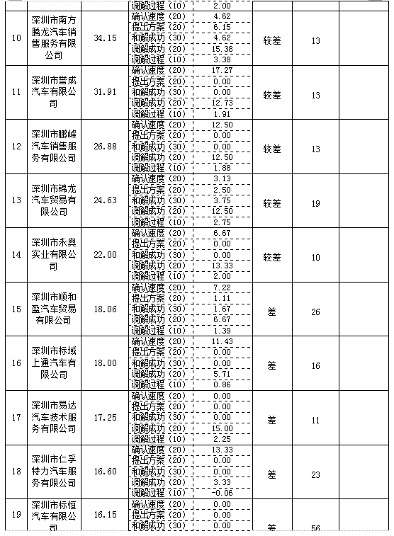 在細(xì)分指標(biāo)方面,深圳市標(biāo)域汽車有限公司、深圳標(biāo)特汽車(集團(tuán))有限公司和深圳市宏創(chuàng)陸風(fēng)汽車銷售有限公司等27家企業(yè)處理投訴不及時(shí),未積極與消費(fèi)者先行和解,導(dǎo)致其企業(yè)“確認(rèn)速度”、“提出方案”和“和解成功”三項(xiàng)分項(xiàng)指標(biāo)的分?jǐn)?shù)皆為0,嚴(yán)重影響了企業(yè)的消費(fèi)維權(quán)信用指數(shù)和信用等級(jí)。深圳市仁孚特力汽車服務(wù)有限公司、深圳市安進(jìn)汽車貿(mào)易有限公司和深圳市大興寶譽(yù)汽車銷售服務(wù)有限公司在由消委會(huì)工作人員評(píng)分的“調(diào)解過程”分項(xiàng)指標(biāo)分?jǐn)?shù)為負(fù)分,3家企業(yè)存在不配合調(diào)解甚至拒絕調(diào)解的情況,解決消費(fèi)糾紛的誠(chéng)意度較差;另外,深圳市宏創(chuàng)陸風(fēng)汽車銷售有限公司的消費(fèi)維權(quán)信用指數(shù)為0,誠(chéng)意度和滿意度為0,10宗消費(fèi)投訴皆未處理成功,排名最后。