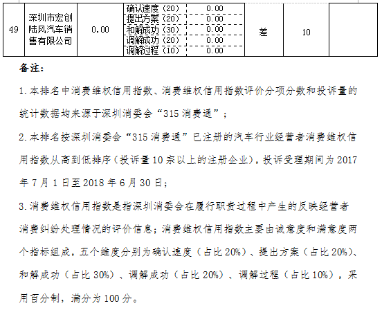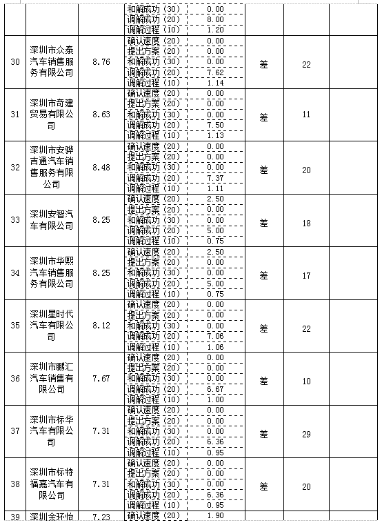 在細(xì)分指標(biāo)方面,深圳市標(biāo)域汽車有限公司、深圳標(biāo)特汽車(集團(tuán))有限公司和深圳市宏創(chuàng)陸風(fēng)汽車銷售有限公司等27家企業(yè)處理投訴不及時(shí),未積極與消費(fèi)者先行和解,導(dǎo)致其企業(yè)“確認(rèn)速度”、“提出方案”和“和解成功”三項(xiàng)分項(xiàng)指標(biāo)的分?jǐn)?shù)皆為0,嚴(yán)重影響了企業(yè)的消費(fèi)維權(quán)信用指數(shù)和信用等級(jí)。深圳市仁孚特力汽車服務(wù)有限公司、深圳市安進(jìn)汽車貿(mào)易有限公司和深圳市大興寶譽(yù)汽車銷售服務(wù)有限公司在由消委會(huì)工作人員評(píng)分的“調(diào)解過程”分項(xiàng)指標(biāo)分?jǐn)?shù)為負(fù)分,3家企業(yè)存在不配合調(diào)解甚至拒絕調(diào)解的情況,解決消費(fèi)糾紛的誠(chéng)意度較差;另外,深圳市宏創(chuàng)陸風(fēng)汽車銷售有限公司的消費(fèi)維權(quán)信用指數(shù)為0,誠(chéng)意度和滿意度為0,10宗消費(fèi)投訴皆未處理成功,排名最后。