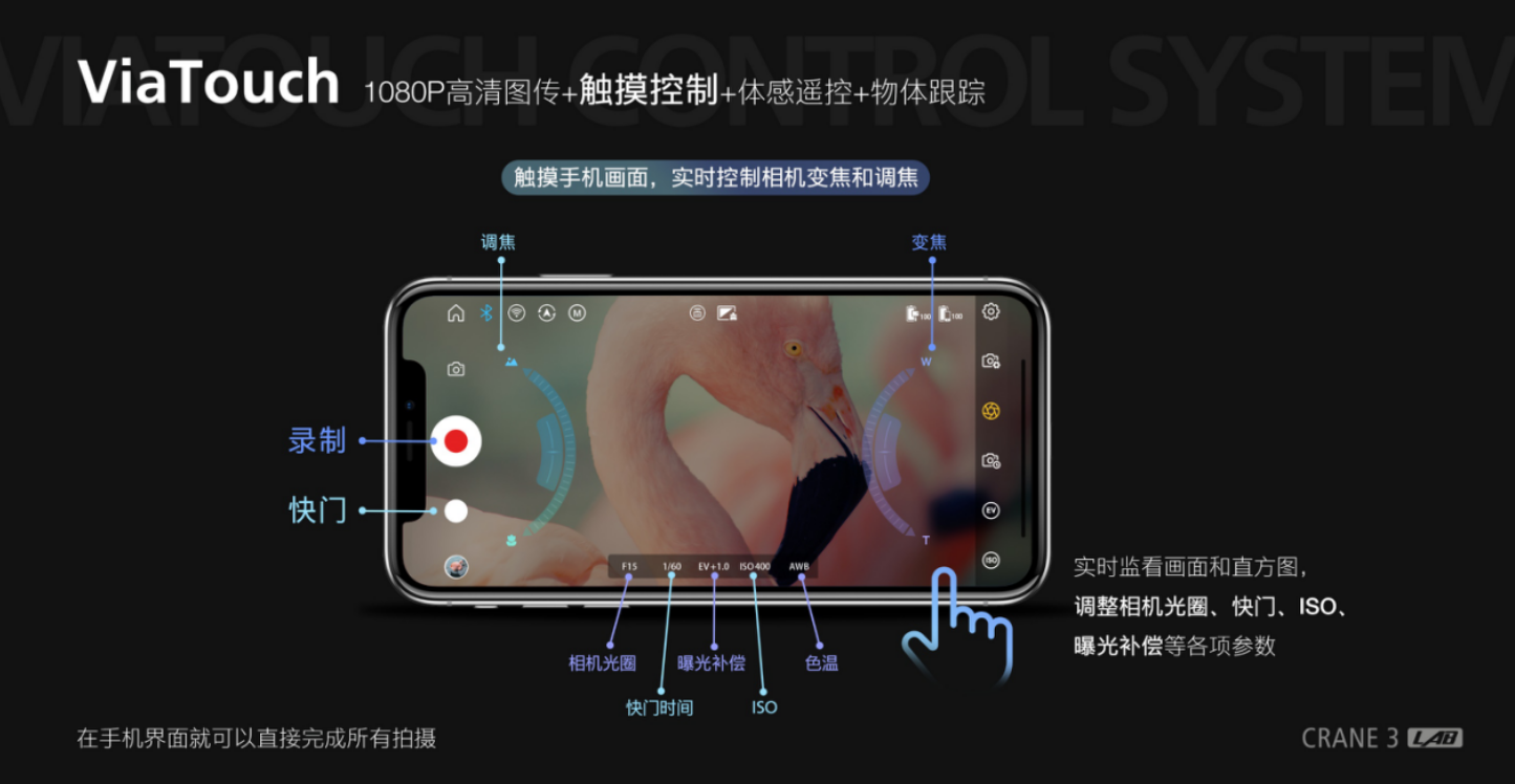 全新的ViaTouch交互功能:云鶴3 LAB搭載旗艦無線圖傳系統(tǒng),最高支持1080P的分辨率,手機(jī)、平板都能成為單反監(jiān)視屏,實(shí)時(shí)監(jiān)看畫面構(gòu)圖和各項(xiàng)參數(shù)。在手機(jī)界面就可以直接完成所有拍攝;還能實(shí)時(shí)監(jiān)看畫面和直方圖,調(diào)整相機(jī)光圈、快門、ISO、曝光補(bǔ)償?shù)雀黜?xiàng)參數(shù)。觸摸手機(jī)畫面,實(shí)時(shí)控制相機(jī)變焦和調(diào)焦。取下作為監(jiān)視器的手機(jī),即可變身成為一臺體感遙控器,一機(jī)兩用。在手機(jī)中框選住想要追蹤的物體,穩(wěn)定器就會控制相機(jī)自動跟隨物體進(jìn)行拍攝。