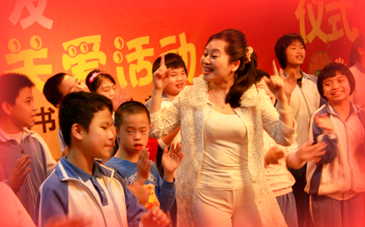 十年堅持義務(wù)為盲童教唱的愛心藝術(shù)家鄭海燕與盲童在一起