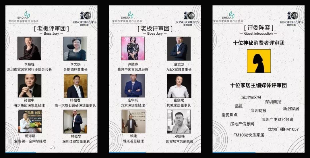 其中,由簡一大理石瓷磚、海爾卡薩帝、慕思寢具、A&X家具、方太電器、構城定制、雅樂薈、寶能第一空間、國安居、佳得寶等家居行業(yè)知名品牌老總組成的老板評審團特別引人注目。組委會特別介紹,這些品牌在行業(yè)的影響力有目共睹,他們的認可是對設計能力與市場影響力不可置疑的肯定。