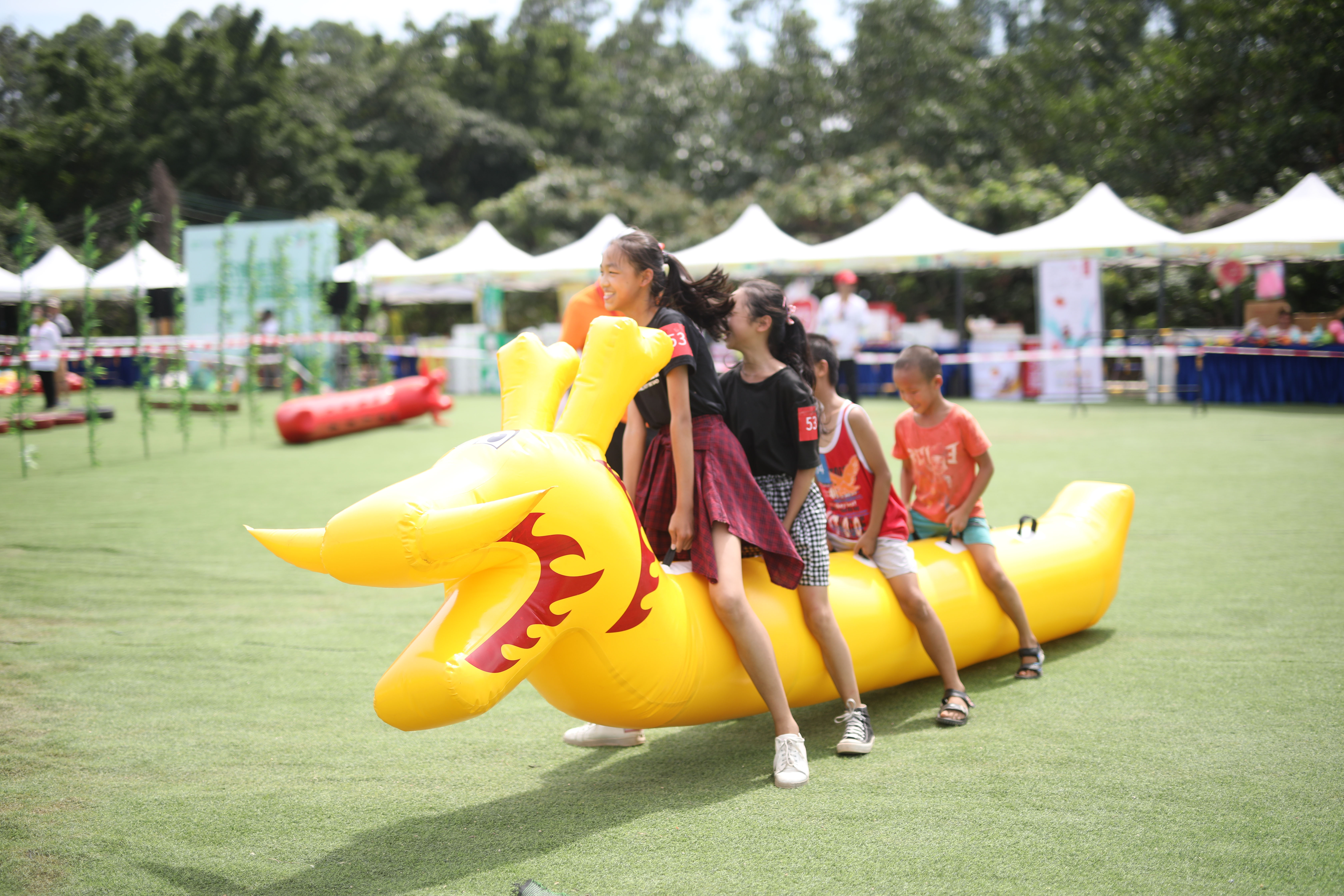家長(zhǎng)小朋友共騎在龍舟上用腳往前沖,有的隊(duì)伍步調(diào)一致,快速地奔向終點(diǎn),贏得觀眾的齊聲喝彩而有的隊(duì)伍則踉踉蹌蹌,引起觀眾陣陣笑聲。