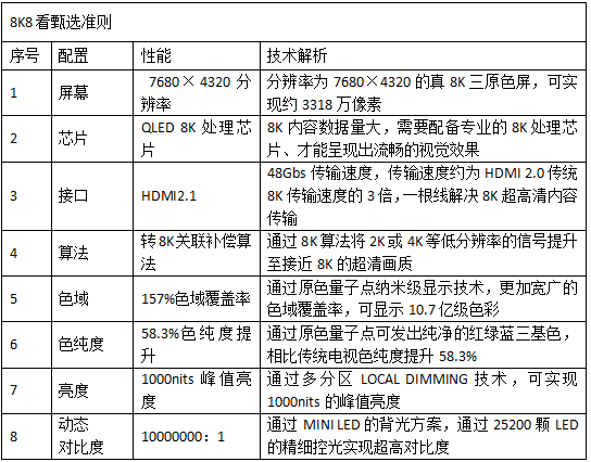 在行業(yè)趨勢(shì)及國(guó)家政策的雙重推動(dòng)下,為正確引導(dǎo)8K電視市場(chǎng)發(fā)展方向、加快發(fā)展步伐,TCL聯(lián)合國(guó)家廣播電視產(chǎn)品質(zhì)量監(jiān)督檢驗(yàn)中心經(jīng)過(guò)長(zhǎng)時(shí)間的市場(chǎng)調(diào)研及總結(jié),從行業(yè)整體的角度對(duì)8K電視進(jìn)行了初步探討,并編制出《8K8看甄選白皮書(shū)》。這份白皮書(shū)告訴我們,實(shí)現(xiàn)真正的8K震撼視覺(jué)體驗(yàn)關(guān)鍵性能/技術(shù)要求如下。