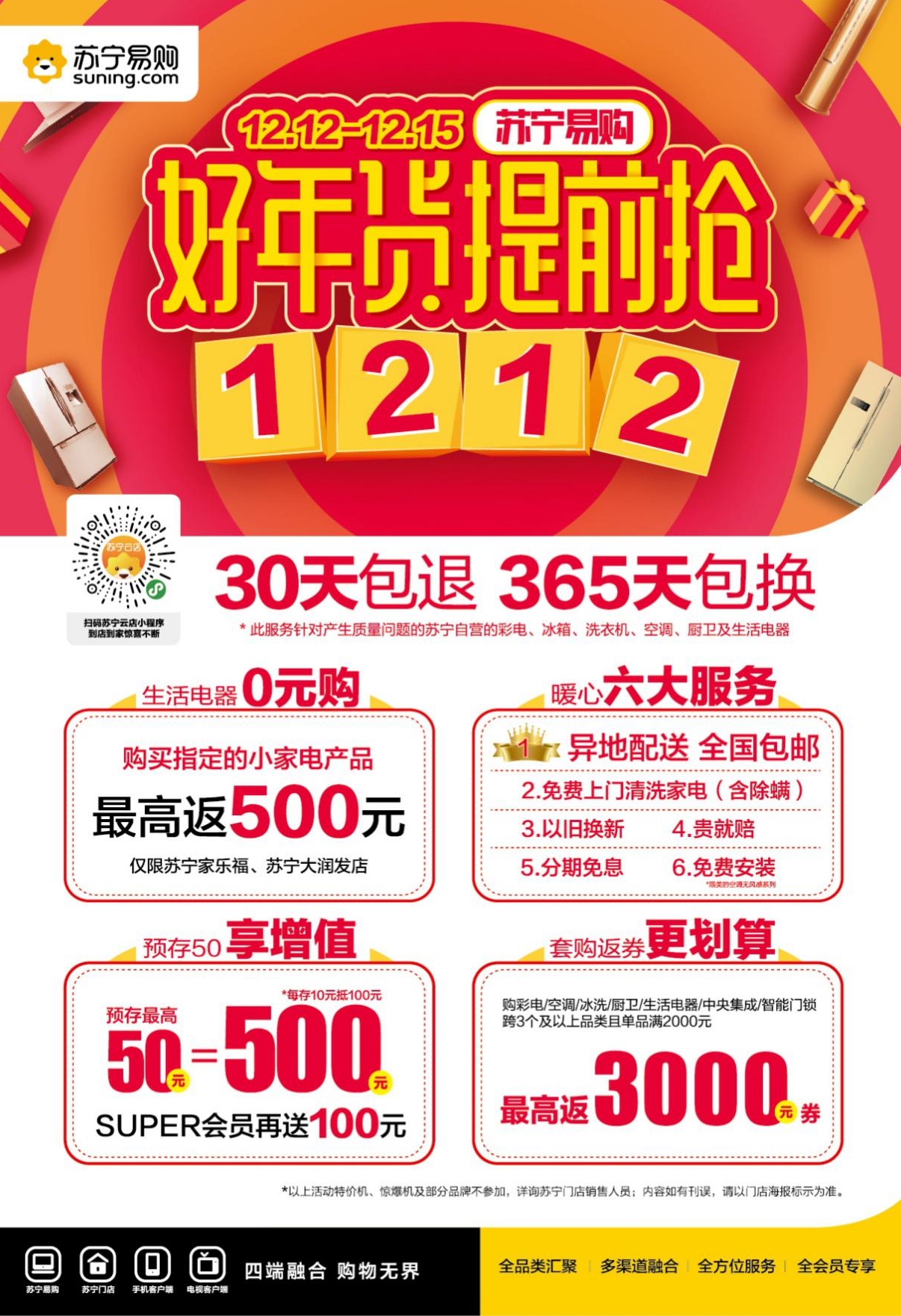 同時,深圳蘇寧還聯(lián)合各大知名品牌為廣大消費(fèi)者推出了多重超強(qiáng)福利,在活動力度上,預(yù)存50元可抵500元的家電購物抵用券,并且套購多個產(chǎn)品最高可返3000元的優(yōu)惠券。除此之外,蘇寧家樂福、蘇寧大潤發(fā)、蘇寧歐尚聯(lián)合推出生活家電0元購活動,消費(fèi)者購買生活電器可返產(chǎn)品價格的同等金額,最高省500元。并且雙十二當(dāng)天在蘇鮮生購物使用蘇寧金融支付新用戶滿50元減20元,老用戶滿30元減10元,12月15日在蘇寧小店購物使用翼支付還可享5折立減??梢灶A(yù)見,從產(chǎn)品、價格、服務(wù)、活動各個方面不斷提升消費(fèi)者購物體驗(yàn)的深圳蘇寧將成為消費(fèi)者選購年貨的不二選擇。(吳艷)