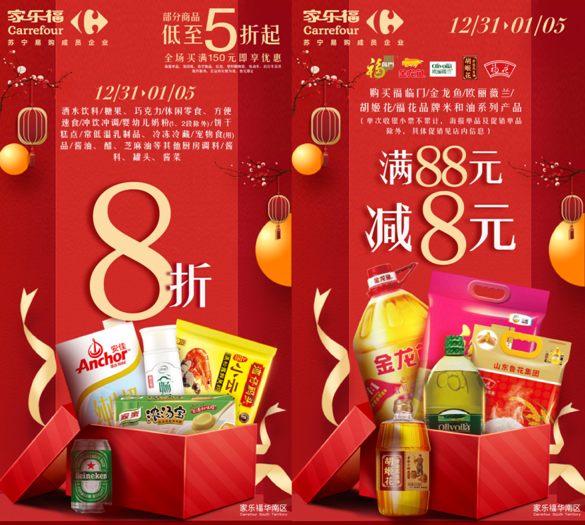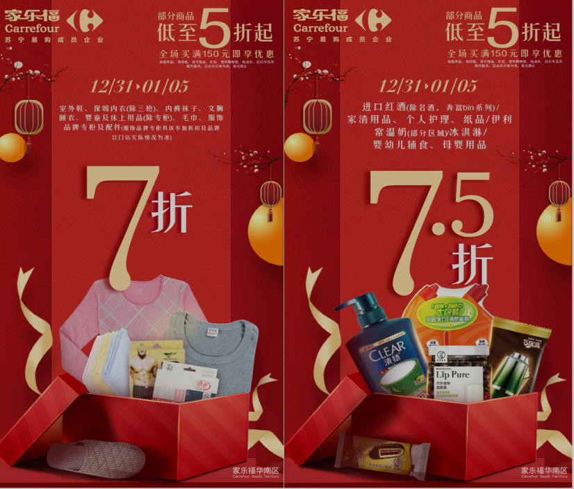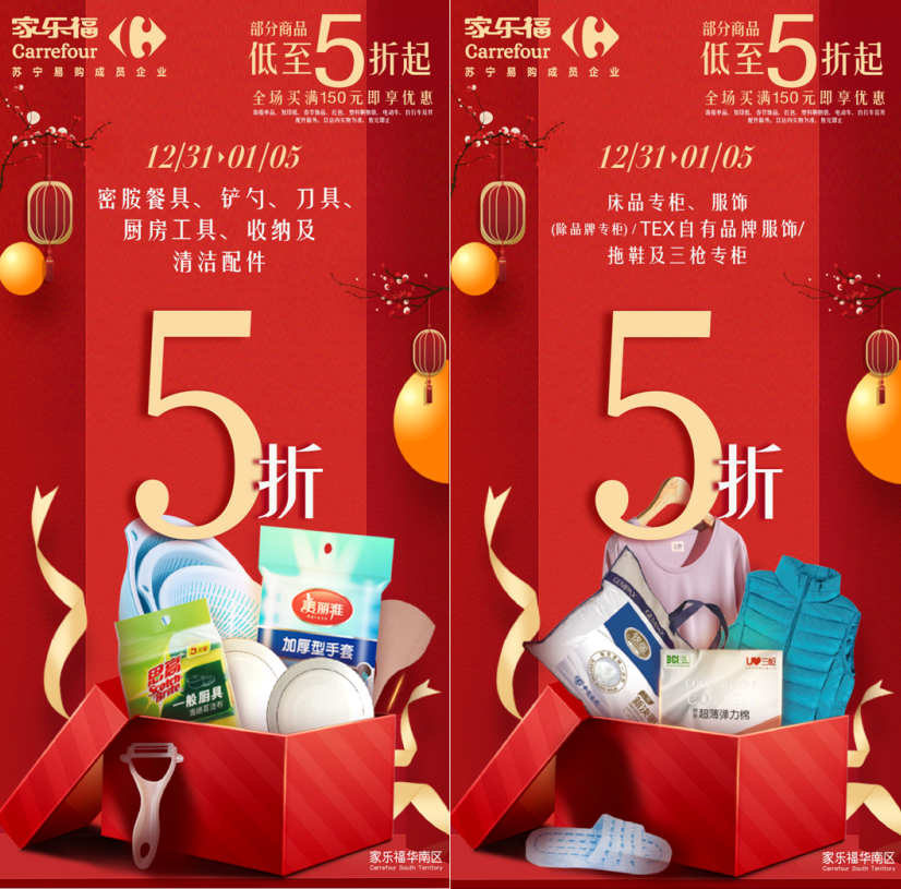 12月31日至1月5日,顧客于家樂福華南區(qū)門店全場(chǎng)買滿150元,即享指定產(chǎn)品5折起優(yōu)惠,省錢攻略一次解鎖。