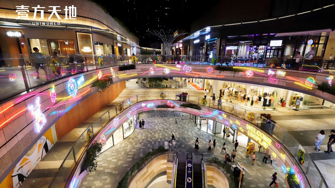 “顏值是第一生產(chǎn)力”,要打造夜間標(biāo)桿,氛圍營造必不可少。壹方天地將燈飾與建筑、綠植等多個(gè)元素巧妙結(jié)合,璀璨的景觀燈、夢幻的星星燈、妙趣橫生的IP主題霓虹燈烘托出獨(dú)具一格的藝術(shù)氛圍。夜晚時(shí)分搭配噴泉秀和噴霧,光影夢幻,玉壺光轉(zhuǎn),營造出極富層次感的夜景。同時(shí),通過加強(qiáng)外圍的燈光照明等,持續(xù)亮化夜間氛圍,壹方天地成為夜間休閑、聚會的絕佳場所?!跋M(fèi)者沒事也喜歡來走一走,享受工作之余的休閑時(shí)光?!迸藸N峰說道。