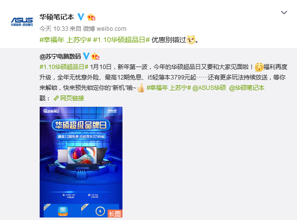 1月10日,今年的蘇寧易購華碩超品日將再次啟動,1月3日正式進入預(yù)熱階段,今天早上蘇寧電腦數(shù)碼官微賬號,發(fā)布了今年華碩超級品牌日活動的正式信息,華碩官方賬號也第一時間與之進行了回應(yīng)互動。