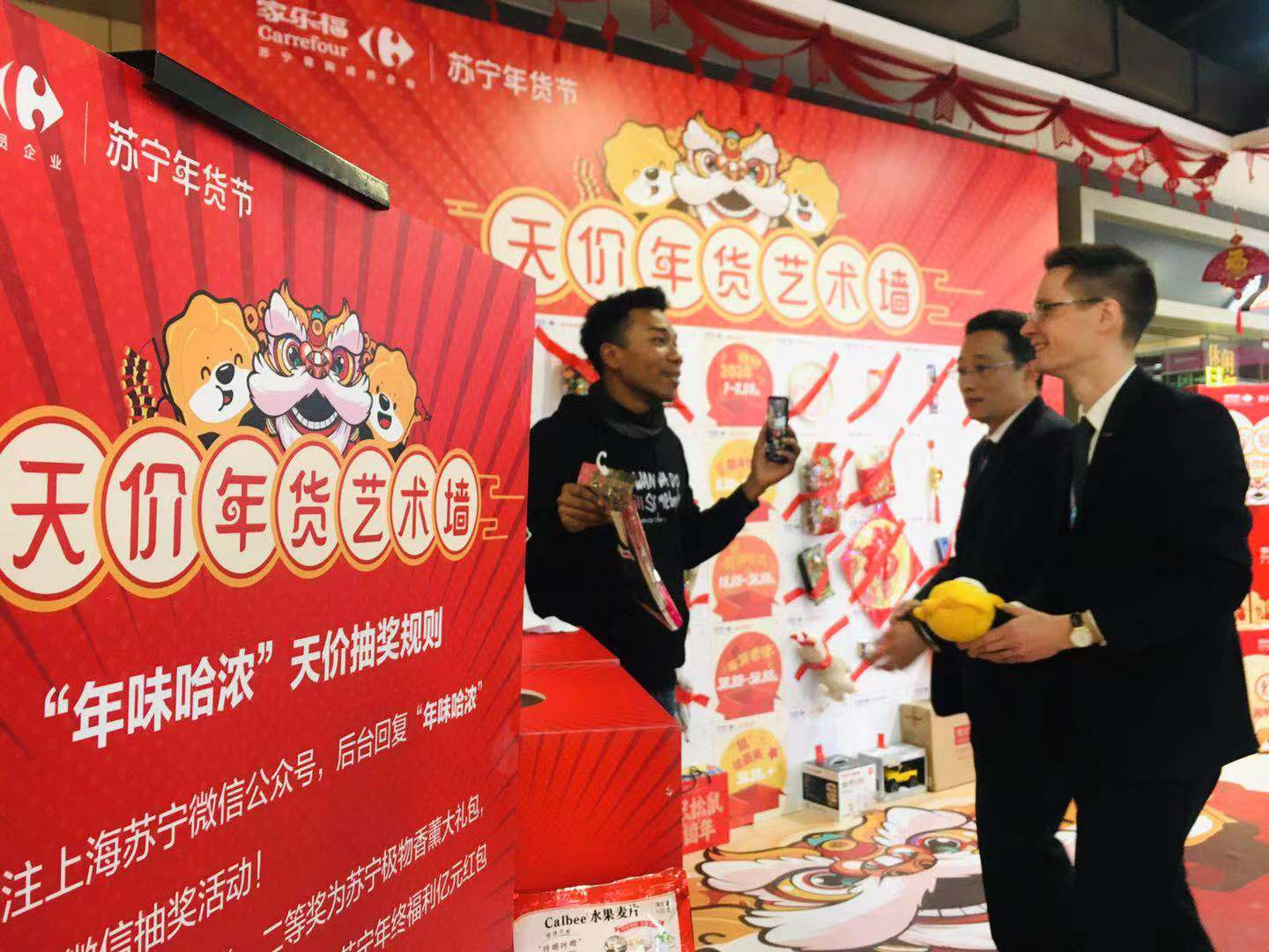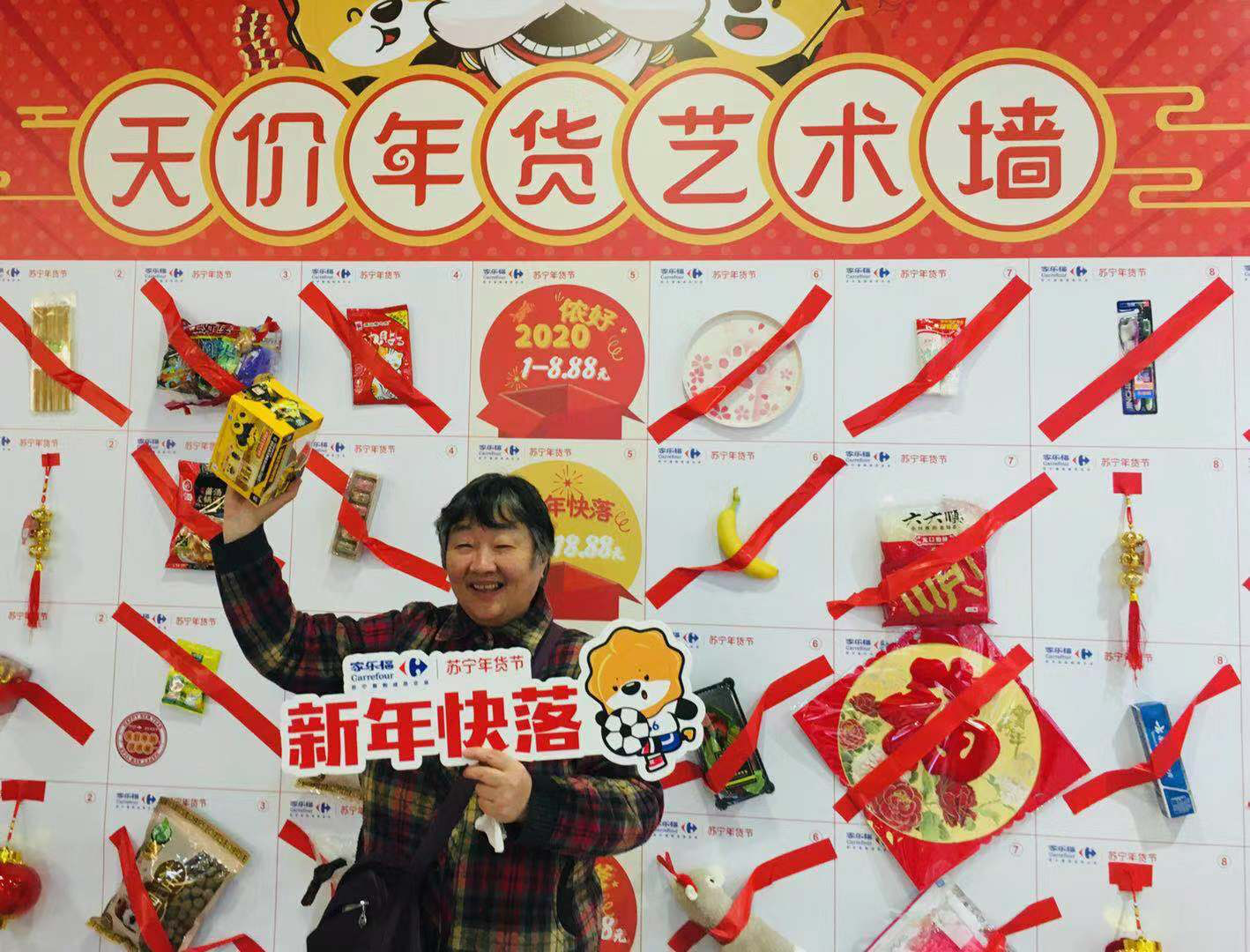 1月10日上午,記者來到家樂福“年味哈濃”天價年貨藝術墻的活動現(xiàn)場,眾多市民正想躍躍欲試。記者發(fā)現(xiàn),在天價年貨藝術墻上,有儂好2020、新年快落、腔調(diào)哈濃、年貨老嗲、“鼠”儂最美五類天價年貨。
