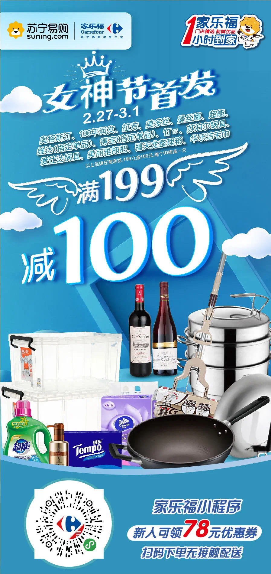 2月27日至3月1日,在家樂福小程序購買奧格斯汀、100年潤發(fā)、拉芳、美多絲、曼絲娜、超能、維達(dá)(指定單品)、得寶(指定單品)、蘇泊爾鍋具、愛仕達(dá)鍋具、美麗雅拖把等非食品類指定品牌滿199立減100元。
