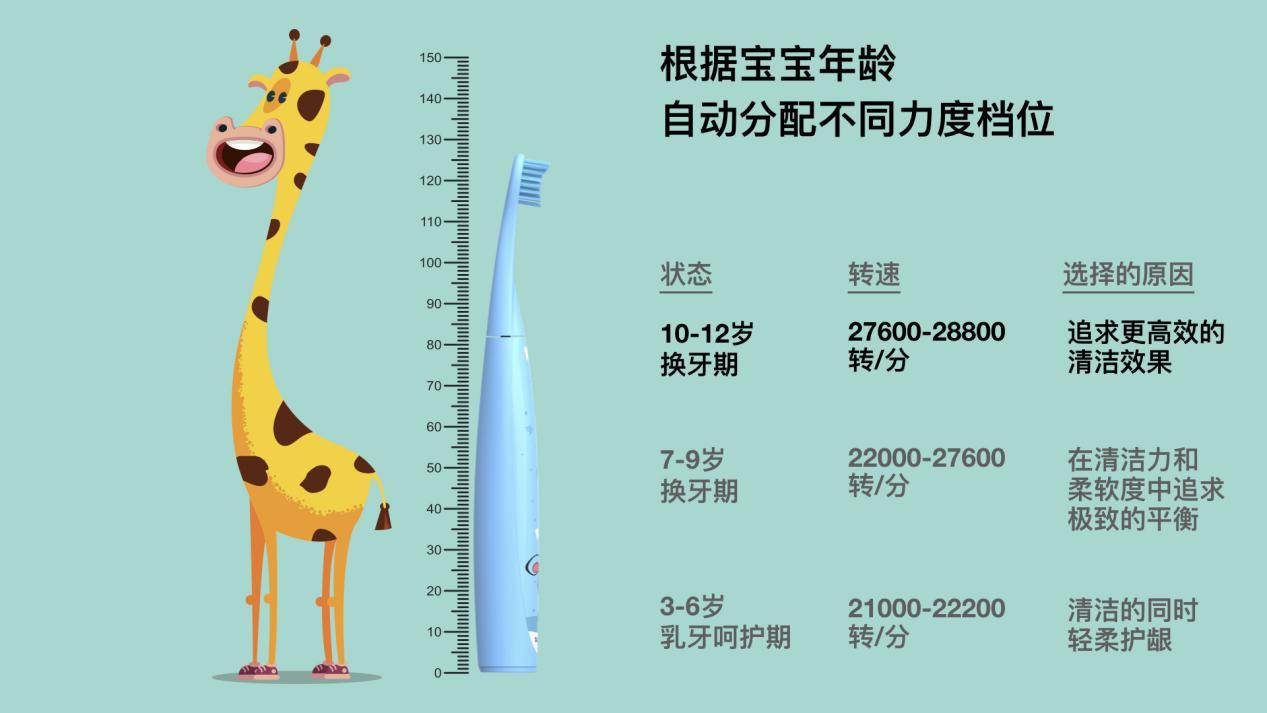 根據(jù)孩子的乳牙期、換牙期以及相應(yīng)年齡段特點,S7000K可以自動分配不同的轉(zhuǎn)速力度檔位功能,分階呵護,讓孩子刷牙放心無憂。