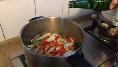 每個(gè)生蠔手工挑選,新鮮肥美!沖洗干凈,放入高壓鍋,放大蔥絲、姜片、紅辣椒絲,倒入啤酒,開(kāi)火!隔酒蒸,上氣后,蒸30秒-1分鐘,就可以開(kāi)鍋啦!