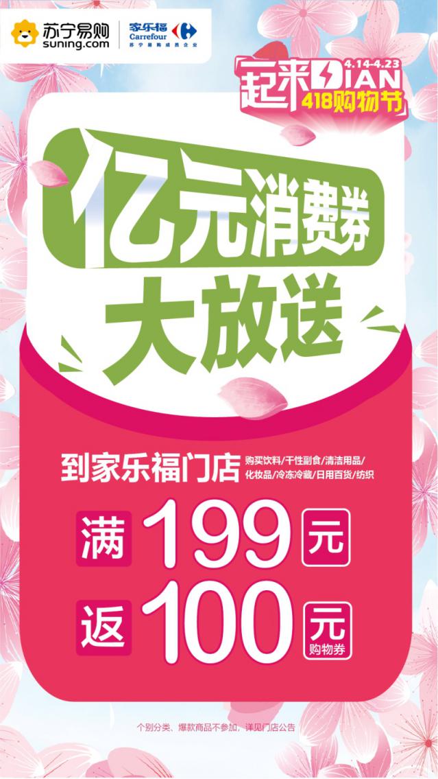 4月9日,家樂(lè)福宣布面向全國(guó)消費(fèi)者發(fā)放總額過(guò)億的家樂(lè)福消費(fèi)券,旨在提振市民消費(fèi)信心,促進(jìn)消費(fèi)回暖?!?18一起來(lái)Dian”購(gòu)物節(jié)期間,凡在家樂(lè)福全國(guó)209家線下門店購(gòu)物滿199元,即可獲贈(zèng)總值100元的消費(fèi)券(5張20元消費(fèi)券),覆蓋眾多暢銷品類以及剛需民生商品(消費(fèi)券可在指定期間使用)。
