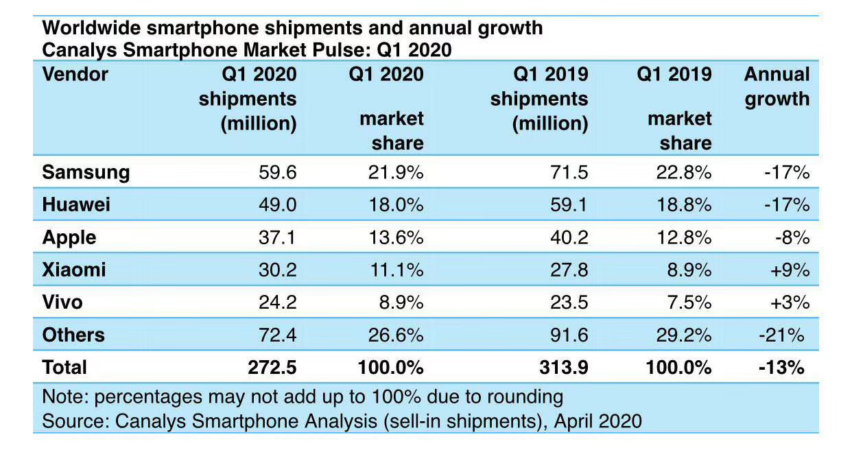 另一家國際權(quán)威機構(gòu)Canalys也在今天發(fā)布了今年一季度全球智能手機的出貨量報告,前五大手機廠商的排名和IDC的報告一樣。該報告顯示,今年一季度全球智能手機出貨量受新冠疫情影響下降13%,而vivo在重回前五的同時,全球出貨量逆勢同比增長3%。