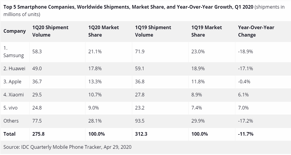 見圳客戶端·深圳新聞網(wǎng)2020年5月6日訊 國際權(quán)威機構(gòu)IDC最新報告顯示,全球智能手機出貨量在2020年第一季度同比下降11.7%。其中,三星、華為、蘋果依舊穩(wěn)居前三,分別為21.1%、17.8%和13.3%。