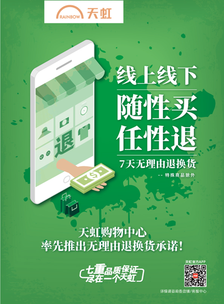 今年4月,為了營造溫暖舒心的消費環(huán)境,深圳市消費者委員會發(fā)起“線下無理由退貨承諾”,鼓勵深圳線下實體店參與,改善居民消費體驗,增強(qiáng)居民消費信心。天虹積極響應(yīng)號召,作為深圳首批“線下無理由退貨”的實體店參與并向廣大消費者作出服服承諾,也將“承諾”推廣至全國。值得一提的是,為了讓購物中心的消費者能共享,天虹首次嘗試在購物中心業(yè)態(tài)也深耕這項服務(wù),竭力滿足顧客需求。