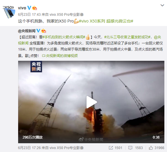 見圳客戶端 ·深圳新聞網(wǎng)2020年6月28日訊 北斗系統(tǒng)第五十五顆導(dǎo)航衛(wèi)星暨北斗三號最后一顆全球組網(wǎng)衛(wèi)星,6月23日9時43分成功發(fā)射。為了多角度拍攝火箭點火,央視新聞在導(dǎo)流槽附近架設(shè)多臺vivo X50 Pro手機,一臺位于導(dǎo)流槽旁邊,距離火箭10米的位置,用于拍攝點火近景;兩臺架設(shè)在導(dǎo)流槽后方30米的距離,用于拍攝點火中景,以及點火后的蒸汽場景。