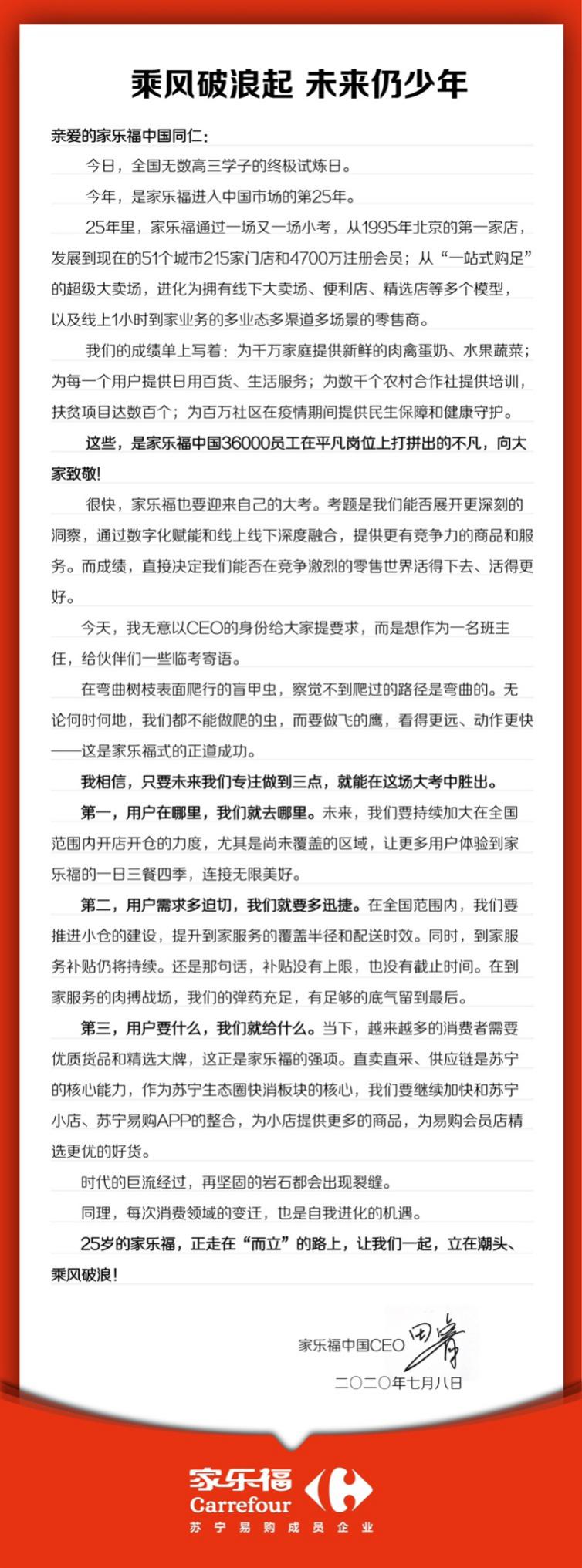 見圳客戶端·深圳新聞網(wǎng)2020年7月9日訊 今年,是家樂福進(jìn)入中國市場的第25個(gè)年頭。昨日,蘇寧家樂福CEO田睿發(fā)出內(nèi)部郵件,表示家樂?!盁o論何時(shí)何地,都不能做爬的蟲,而要做飛的鷹”,將持續(xù)加大在全國范圍內(nèi)開店開倉的力度,并通過小倉建設(shè)和補(bǔ)貼,提升到家服務(wù)的覆蓋半徑和配送時(shí)效。