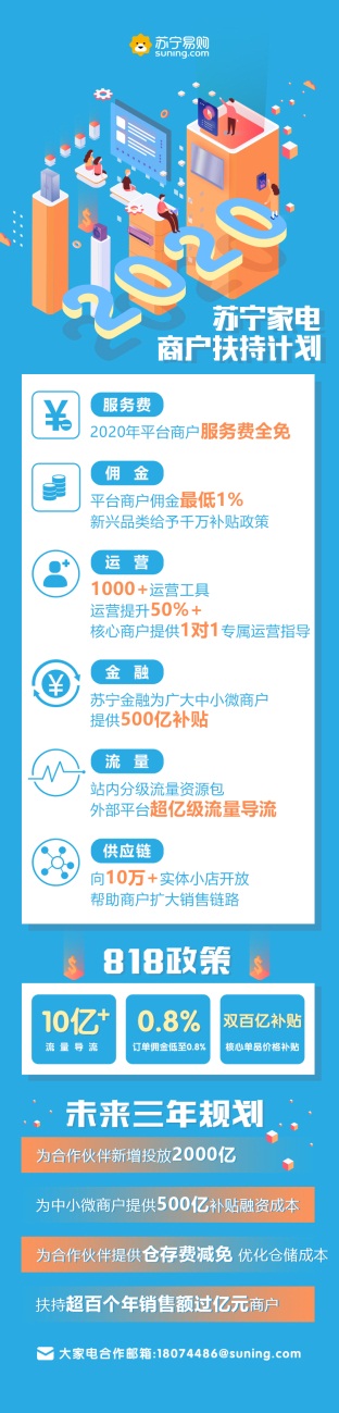 蘇寧宣布,2020年蘇寧將免收平臺(tái)商戶服務(wù)費(fèi);向中小微商戶提供500億補(bǔ)貼融資成本,幫助商戶緩解資金壓力;平臺(tái)上的商品供應(yīng)鏈會(huì)向蘇寧生態(tài)中10萬(wàn)+實(shí)體小店開(kāi)放,幫助商戶擴(kuò)大銷(xiāo)售通路。同時(shí),大家電行業(yè)線將持續(xù)給平臺(tái)商戶匹配站內(nèi)外的億級(jí)流量,并通過(guò)星河生態(tài)賦能平臺(tái)開(kāi)放1000+運(yùn)營(yíng)工具,針對(duì)核心商戶提供1對(duì)1專(zhuān)屬運(yùn)營(yíng)指導(dǎo),借此幫助商戶有效提升經(jīng)營(yíng)效率,降低運(yùn)營(yíng)成本。
