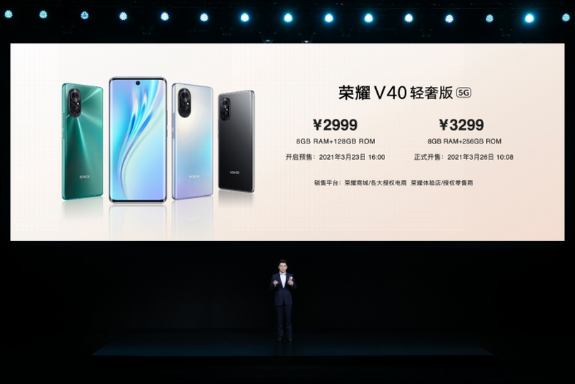榮耀V40輕奢版擁有幻夜黑、藍(lán)水翡翠和鈦空銀三種配色,提供8GB+128GB、8GB+256GB兩個(gè)內(nèi)存版本,售價(jià)分別為2999元和3299元。3月26日10:08在線上線下全平臺(tái)開(kāi)售,用戶可通過(guò)榮耀商城及各大授權(quán)電商平臺(tái)或前往榮耀線下體驗(yàn)店、榮耀授權(quán)零售門(mén)店進(jìn)行購(gòu)買(mǎi)。