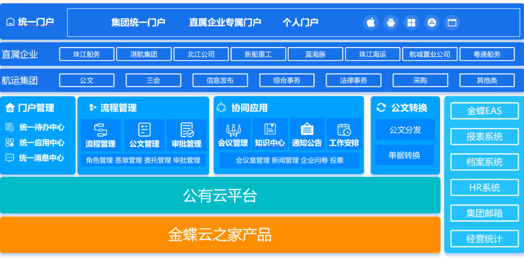 作為大型綜合性國企,廣東航運集團現(xiàn)有直屬企業(yè)8家,擁有全資、控股、參股及代理水路客運港口13家,經(jīng)營和管理96艘粵港澳高速客船。伴隨經(jīng)營規(guī)模的發(fā)展、技術(shù)迭代、應用場景深入,其信息化需要一個可以覆蓋集團協(xié)同應用場景的綜合辦公平臺,而集團原有的OA已經(jīng)無法滿足航運的持續(xù)發(fā)展需要。