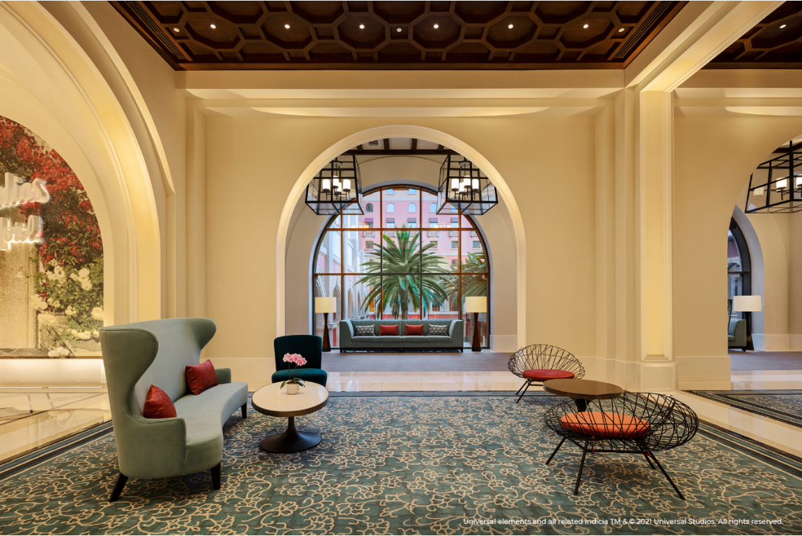 環(huán)球影城大酒店位于北京環(huán)球影城主題公園入口,入住賓客將可以俯瞰園區(qū)的絕佳景觀。作為全球首家以環(huán)球品牌命名的主題酒店,環(huán)球影城大酒店在設(shè)計(jì)中融入了極具加州特色的西班牙復(fù)興風(fēng)格,巧妙再現(xiàn)好萊塢電影黃金時(shí)代的輝煌與風(fēng)華,同時(shí)結(jié)合了中性色調(diào)的現(xiàn)代演繹以及繽紛色彩點(diǎn)綴。酒店大堂內(nèi)西班牙風(fēng)格的噴泉和玻璃馬賽克三角梅花墻帶來(lái)輕快靈動(dòng)的熱帶海岸氣息,定制的橙花調(diào)香氛則令人仿佛置身加州,讓賓客感受到典雅而充滿(mǎn)活力的度假氛圍。酒店公共區(qū)域內(nèi)的珍貴電影海報(bào)將帶領(lǐng)賓客探尋動(dòng)人心扉的光影世界背后,精彩絕倫卻不為人知的創(chuàng)作瞬間。從復(fù)古經(jīng)典系列,到現(xiàn)代電影杰作,更有大量的幕后花絮呈現(xiàn)一段歷久彌新的電影之旅,回溯環(huán)球超過(guò)一個(gè)世紀(jì)的電影歷史的光輝歷程,致敬品牌在光影史上的耕耘與貢獻(xiàn)。