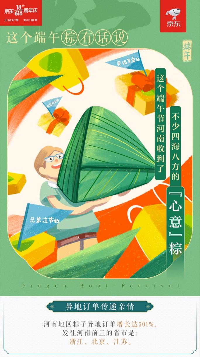 從異地訂單的情況來看,河南地區(qū)粽子異地訂單增長達501%,發(fā)往河南前三的省市是:浙江、北京、江蘇。