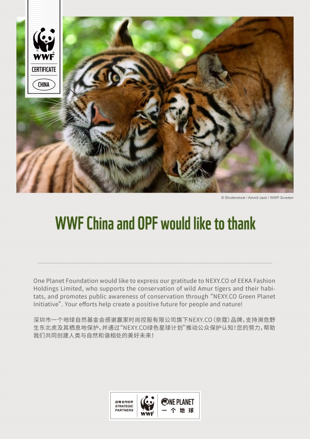2021年,NEXY.CO攜手WWF(世界自然基金會)和OPF(一個地球自然基金會)共同推出2021SS 【綠色星球】公益環(huán)保系列,踏出了綠色環(huán)保公益的關鍵一步。 NEXY.CO通過WWF和OPF,特別捐贈款項用于支持野生東北虎及其棲息地的專項保護,呼吁大家關注瀕危野生動物及其棲息地保護,喚醒人們對自然的關愛。